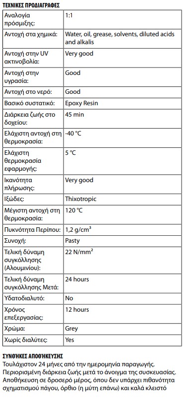 - Ενισχυμένη με ρινίσματα σιδήρου εποξειδική κόλλα δύο συστατικών.