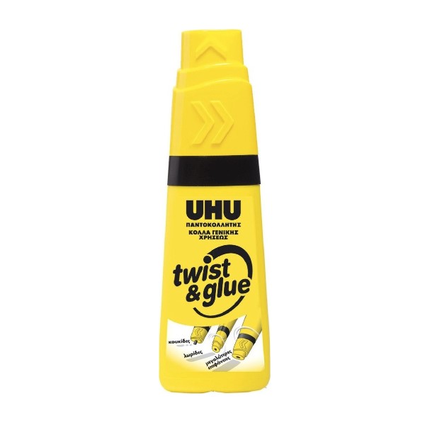 - UHU twist & glue, κόλλα γενικής χρήσεως παντοκολλητής, σε μια μαλακή και εύχρηστη πλαστική φιάλη με το μοναδικό μηχανισμό περιστροφής 3 θέσεων για την κόλληση σημείων, γραμμών και επιφανειών.