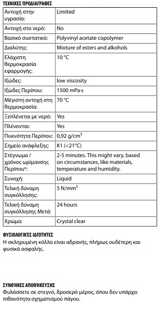 - Περιέχει πτητικούς, ιδιαίτερα εύφλεκτους διαλύτες. Κατά συνέπεια πρέπει να λαμβάνονται κατάλληλες προφυλάξεις κατά την αποθήκευση ή κατά την εργασία με την κόλλα.