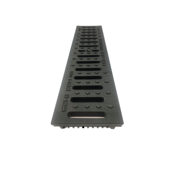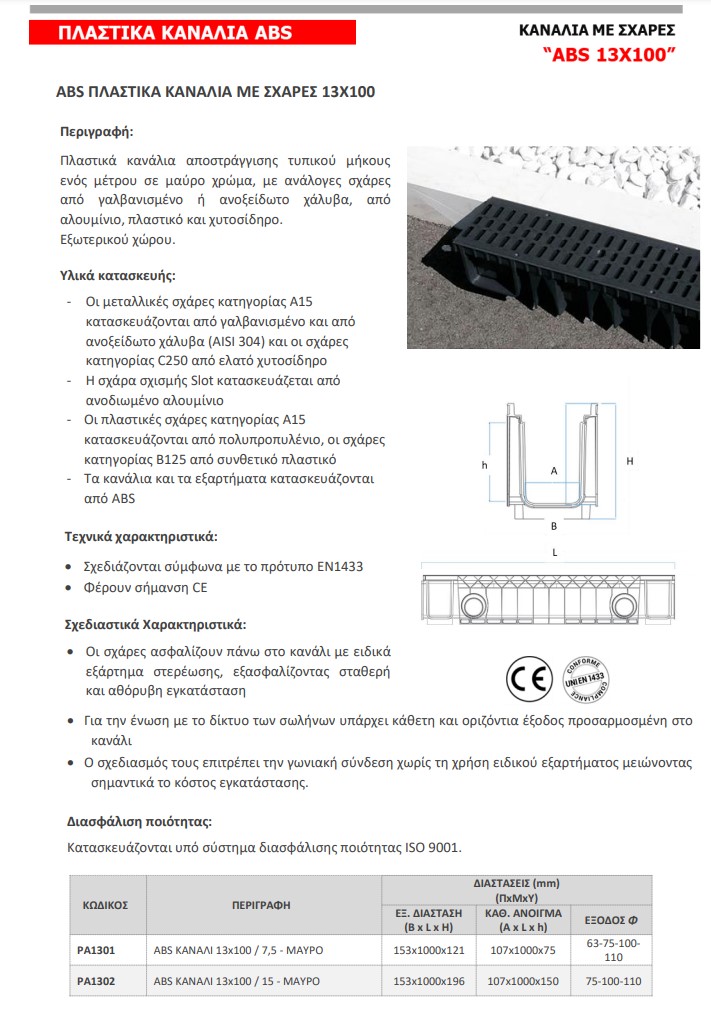 Πλαστικά κανάλια αποστράγγισης τυπικού μήκους ενός μέτρου σε μαύρο χρώμα, με ανάλογες σχάρες από γαλβανισμένο ή ανοξείδωτο χάλυβα, από αλουμίνιο, πλαστικό και χυτοσίδηρο.