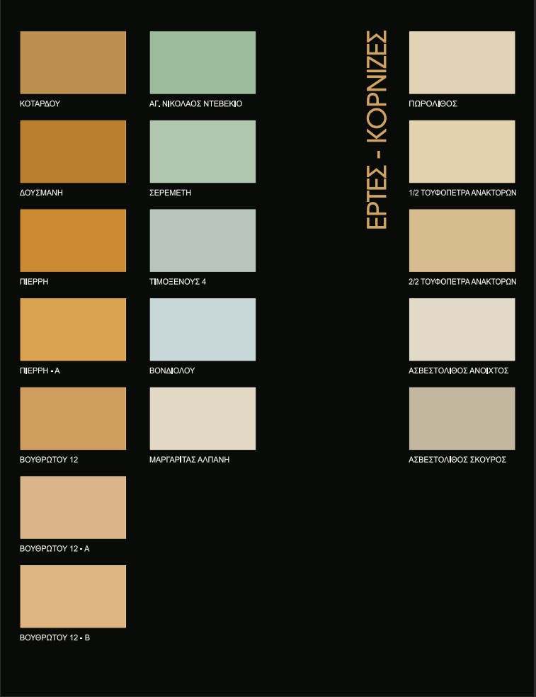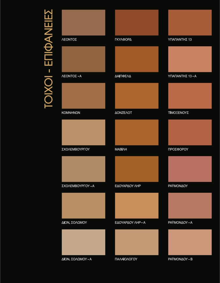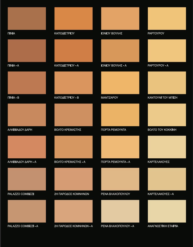 - Οι αποχρώσεις φέρουν την ονομασία των καντουνιών και συχνά τον αριθμό των κτιρίων απ’όπου προέρχονται τα αρχικά δείγματα.
